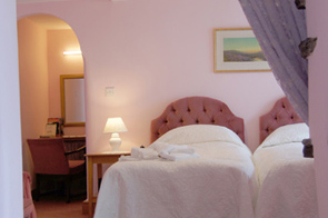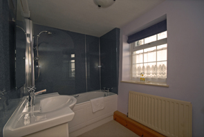 Upstairs are a twin bedded room and a double bedded room, both with large windows on two sides giving extensive views of the valley and both with private bathrooms. The garden is secluded with a delightful little patio.