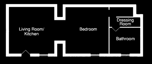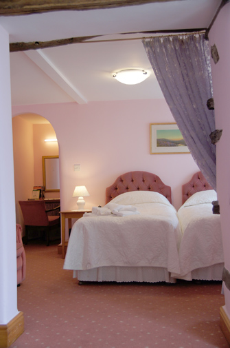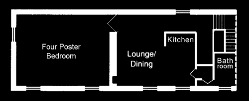 The open plan living room with its oak kitchen and dining facilities leads beneath the old oak beams to the bedroom with 2 single beds and then past the dressing room to the bathroom.